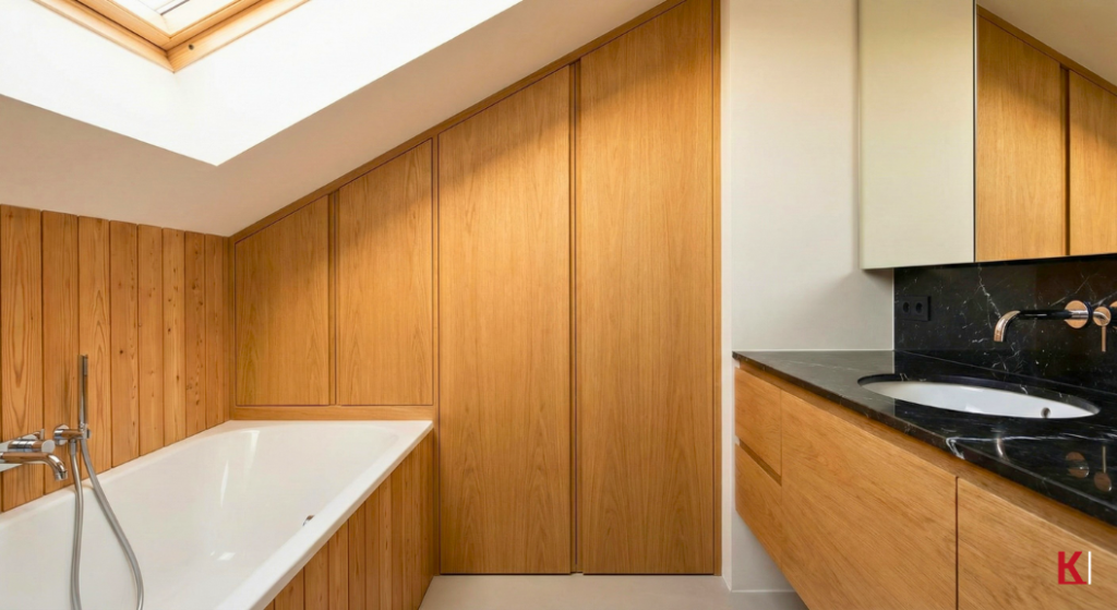 Tipp von Meister Kornmüller: „Wer die Haptik liebt, aber Sicherheit will, wählt oft geölte Eiche für vertikale Flächen (Schrankfronten) und eine robustere Oberfläche (Stein oder Keramik) für den Waschtisch selbst.“